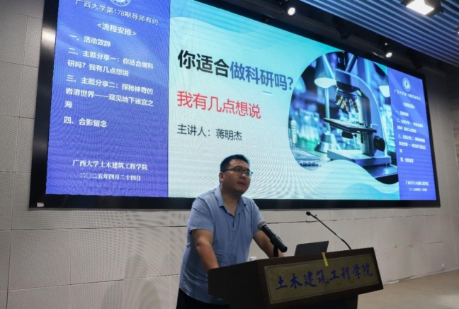 蒋明杰老师以“你适合做科研吗”为引,深入分析了科研的三大动因,并着重强调了努力对于科研的重要性。他指出,科研是一个不断探索、充满未知的过程,其价值在于长期积累和坚持不懈,并以“科研不怕你慢,就怕你停”的箴言,鼓励同学们以长期主义精神深耕学术沃土。