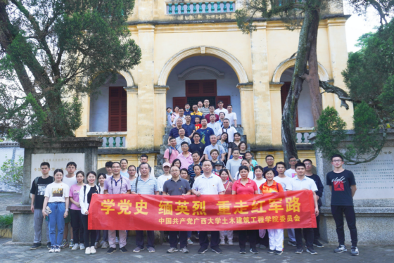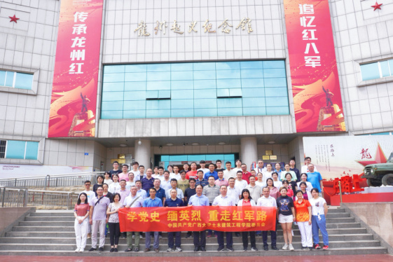 2021年5月15日,学院党委联合设计院有限公司党支部组织师生党员开展“学党史、缅英烈、重走红军路”主题党日活动。学院党委书记戴永恒,副书记、常务副院长陈正以及设计院有限公司党支部书记韦柳梅等一行七十多人赴龙州县瞻仰参观龙州起义纪念馆、红八军起义纪念馆和红八军军部旧址,深入了解龙州起义、红八军反帝反封建的光辉战斗历程和左江各族人民为夺取民主革命胜利前赴后继、英勇奋斗的伟大业绩,感受了血与火的洗礼,进一步传承红色基因,感悟初心使命。学院优秀校友、崇左市委常委、龙州县委书记秦昆和党员师生一道来到龙州起义纪念馆向革命先烈雕像群敬献花篮、向革命先烈默哀、行鞠躬礼,深切缅怀革命先烈。