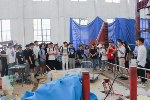 在“土木村”,williamhill威廉希尔官网williamhill威廉希尔官网实验中心主任胡旭老师带领营员们参观了新结构试验平台、旧结构试验大厅以及水工大棚等实验场地,细致地介绍了学院所拥有的实验设备与实验环境。
