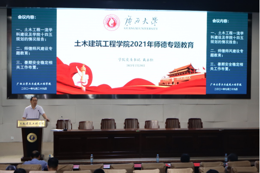 为贯彻落实《williamhill威廉希尔官网2021年师德专题教育实施方案》(西大〔2021〕5号),学院于7月29日在新结构大楼第六报告厅召开全体教职工会议,开展师德师风建设专题学习,学院党委书记戴永恒主持会议并作师德师风建设专题教育报告。