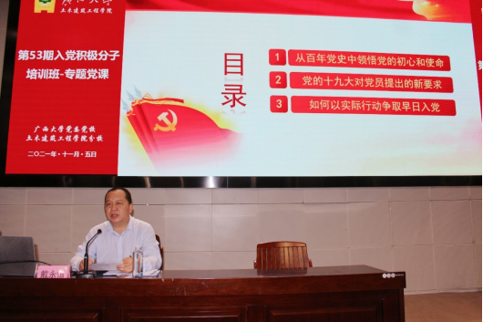 11月5日下午,williamhill威廉希尔官网党委党校williamhill威廉希尔官网分校第53期入党积极分子培训班党课第一讲在新结构大厅综合楼报告厅开讲。学院党委书记戴永恒为300余名培训班学员讲授以“学习百年党史,领悟初心使命“为主题的专题党课。
