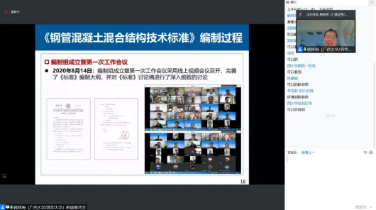 会上,williamhill威廉希尔官网校党委常委、副校长、川藏铁路特大桥梁工程研究院院长韩林海教授作了《钢管混凝土混合结构技术标准》(GB/T51446-2021)的科研成果学术报告。从制订背景、制订工作概况、理论基础、工程应用技术、主要内容等方面介绍了《钢管混凝土混合结构技术标准》。特别是从关键科学问题、主要创新点(核心混凝土受被动约束效应机制及本构模型、常遇和极端作用下结构的力学性能及承载力计算方法、发展了钢管混凝土混合结构设计理论)等方面着重介绍了该规范的理论基础,使行业人员了解了该规范编制的过程、理论基础以及已支撑建设的工程项目,为行业人员更加全面、深入地理解该规范,并将低碳环保的钢管混凝土混合结构推广到实际工程应用提供了技术指导和帮助。