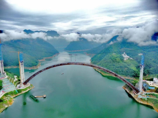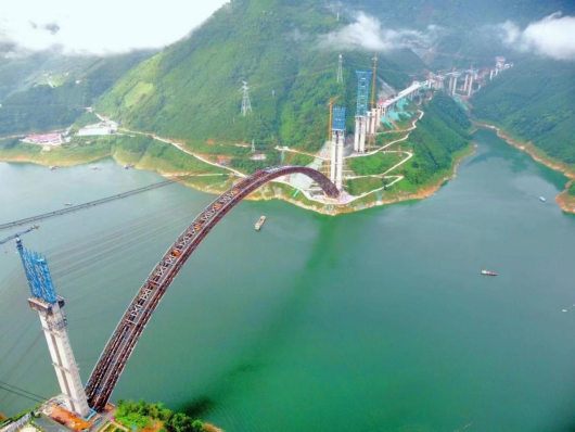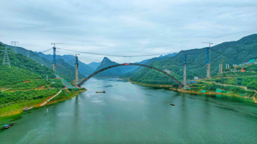 天峨龙滩特大桥,位于河池市天峨县龙滩水库,是南丹至天峨下老高速公路控制性工程、西部陆海新通道高速公路上的一座上承式劲性骨架混凝土拱桥。河池市天峨县是广西最后三个没有通高速的县域之一,目前正在修建的南丹至天峨下老高速公路将改变这一局面。而天峨龙滩特大桥是这条高速公路上的一个重点控制性工程,大桥全长2488.55米。其中,主桥采用上承式劲性骨架混凝土拱桥方案,跨径600米,建成后将成为世界最大跨径拱桥,把混凝土拱桥跨径的世界纪录提高了155米。该桥跨度大,设计、施工难度极高,将成为拱桥建造史上的又一里程碑,同时对于国家战略“一带一路”南向东盟、川藏铁路、西部陆海新通道沿线桥梁工程的建设具有引领性的示范作用。