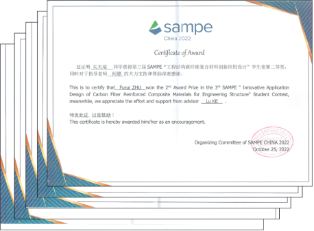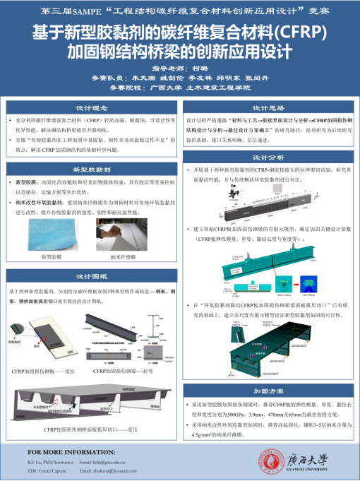 近日,在江苏苏州召开的“SAMPE(国际先进材料与制造工程学会)中国2022年会”上,第三届“工程结构碳纤维复合材料创新应用设计”学生竞赛结果公布并颁奖。威廉希尔官网研究生朱夫瑞、姚剑伦、李友林、邱明东、张闰丹组队参赛(指导老师:柯璐助理教授),提交的作品“基于新型胶黏剂的碳纤维复合材料(CFRP)加固钢结构桥梁的创新应用设计”以并列第四的总成绩获得大赛二等奖。