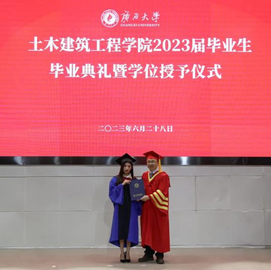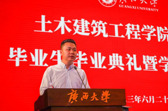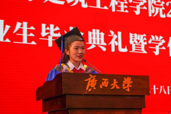 williamhill威廉希尔官网2023届毕业生代表周奕彤发言。她首先向长期支持、关心学生的领导、老师、家人及朋友致以最崇高的敬意和最真挚的感谢,然后通过分享她与土木关于“热爱”的故事号召全体毕业生做时代的筑梦者、追光者,为强国建设、民族复兴贡献青春力量。