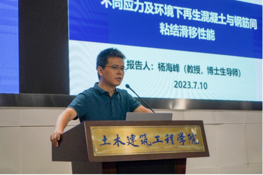 专题报告环节,杨海峰教授作了题为“不同应力及环境下在混凝土与钢筋间的粘结滑移行为”的报告。报告分为四个部分,分别介绍了混凝土与钢筋间粘结滑移行为的研究背景,再生混凝土的相关本构关系及与钢筋间的粘结性能,箍筋被动约束下钢筋与再生混凝土的粘结性能,主动约束下钢筋与再生混凝土的粘结性能。向我们展示了丰富的研究成果同时,激励同学们时刻保持求知探索的心,自强不息,勇于超越。
