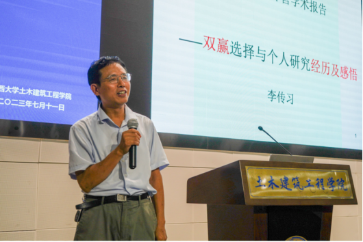 李传习教授用自己的亲身经历勉励在场的师生要学会“修身、齐家、治国、平天下”,面对选择时,“双赢选择”是事业发展的重要途经;作为新时代土木人要面向工程,与时俱进,而作为一名科研人员要体现个人价值,要为人民谋幸福、为民族谋复兴。随后他介绍了自己的团队在特大桥监控、复算与荷载实验方面的代表性成果。最后勉励现场的营员“读万卷书,行万里路”。