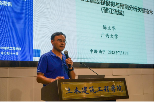 学院副院长陈立华作了题为“岩溶流域径流过程模拟与预测分析关键技术(郁江流域)”。由于广西郁江岩溶流域洪水灾害频发,故构建适用于岩溶流域降雨-径流过程模拟的分布式水文模型和制郁江径流预报方案,服务流域防洪安全及水库调度尤为重要。他向营员们介绍了前期不同降雨量条件下岩溶流域的退水过程的系数以及岩溶水文模型。