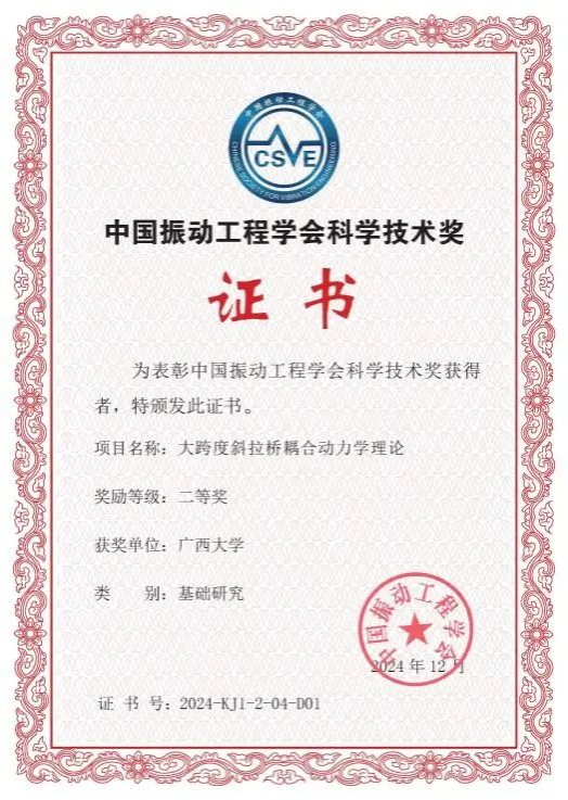 近日,中国振动工程学会正式揭晓了2024年度科学技术奖获奖项目名单,威廉希尔官网康厚军教授领衔的科研团队凭借 “大跨度斜拉桥耦合动力学理论” 项目脱颖而出,荣获基础研究类项目二等奖,为获奖项目中唯一的桥梁工程基础研究项目,表明威廉希尔官网在桥梁动力学领域取得又一重大科研成果。