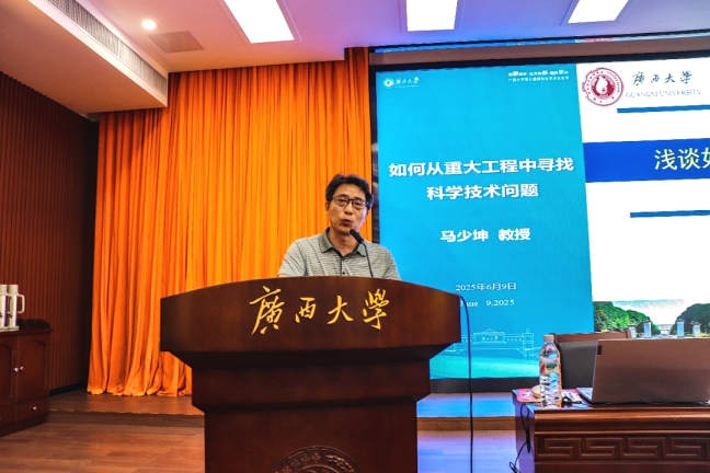 马少坤教授以《如何从重大工程中寻找科学技术问题》为题展开报告。他结合隧道、基坑和桥基等实际工程领域重点介绍了工程科研项目的规划、实施及相关成果,特别强调青年学子要依托重大工程寻找紧接地气的科学问题。同时,他还分享了参与一流团队培养学科融合的创新思维等心得体会。