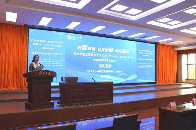 银宁副书记在致辞中对全体学生提出三点期望,勉励大家勇担时代使命,成长为复合型创新人才。她强调,在数智化浪潮下,土木学子要打破学科壁垒,在多学科交叉中探索创新路径;要锤炼学术匠心,以严谨态度深研专业领域,从学术报告中汲取智慧,提升科研能力;更要扎根八桂大地,将论文写在祖国大地上,为建设壮美广西、助力科技自立自强贡献青春力量。