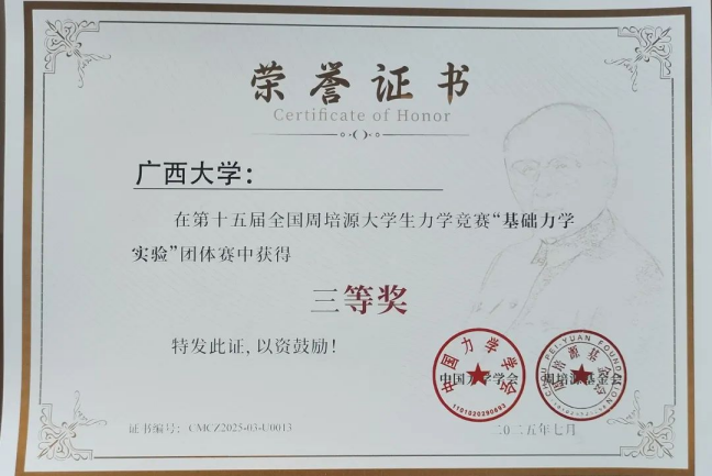本次竞赛,威廉希尔官网教师苏潇阳和丛云跃指导的参赛队伍获得第十五届全国周培源大学生力学竞赛“基础力学实验”团体赛全国三等奖,是广西高校在本项赛事的历史性突破。参赛学生:陈立明、魏芝霖(机械工程学院)、周家旭、颜华南。