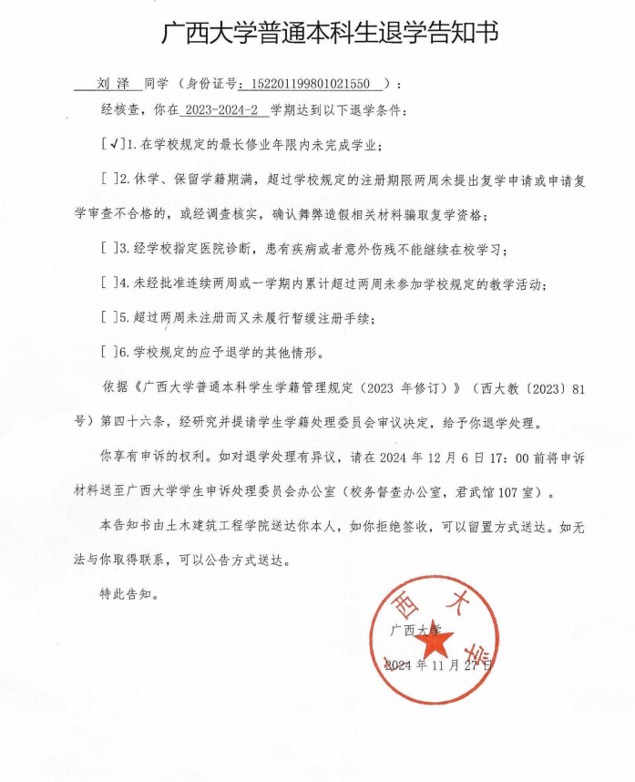 【上一条】关于给予李保军等六名研究生超学习年限退学处理的通知